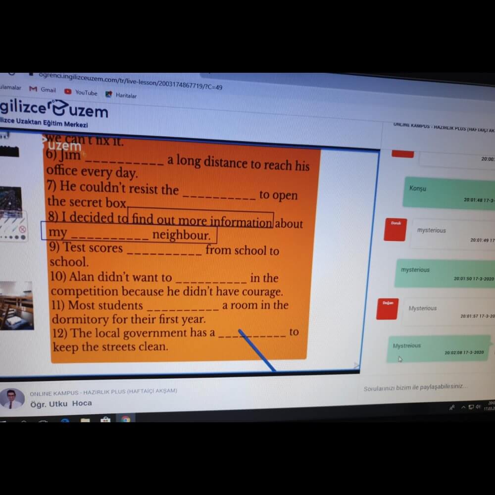 Online derslerde reading derslerine Sıla hoca girmeye başladı. Dersler gerçekten çok verimli geçti. Anlatımını çok beğendim. Utku hocanın anlatımı zaten tartışılmaz. Onun da dersleri çok verimliydi.